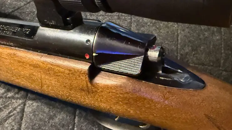 Another oddity is the bolt. The bolt is a Mauser-type action, not the standard Mannlicher action. The shroud on the back of the bolt is also different. The shroud is what engages or disengages the safety. It is a wing-style safety that is operated by pushing down on the right wing to engage the safety and pushing down on the left side of the wing to disengage. When on “fire” there is a red dot on the receiver that matches the wing pushed down to the left. There is a redundant red dot on the back of the shroud that extends outward when the bolt is cocked. Like a Mauser action, when the safety is engaged, it locks both the trigger and the action.